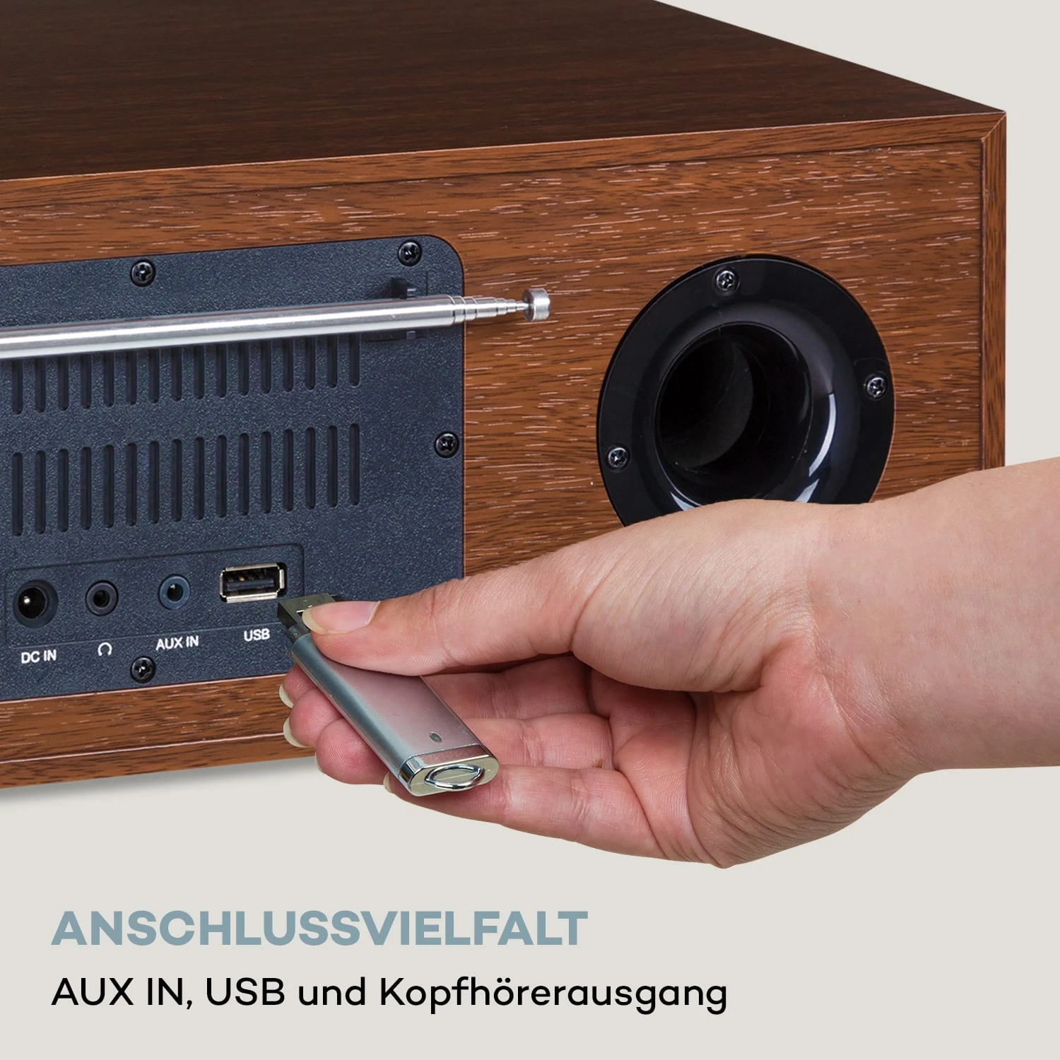 - Anschlüsse: USB, AUX IN und Kopfhörer