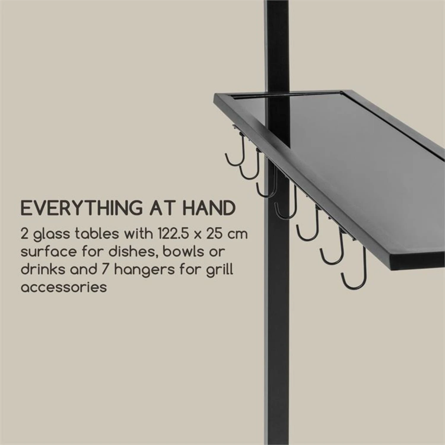 Mit dem Blumfeldt Steakhouse al Sur Pavillon steht dem perfekten Grillergebnis nichts mehr im Weg: denn zwei große Ablageflächen aus schwarzem Glas bieten links und rechts jeweils 122,5 x 25 cm Ablageplatz für Schüsseln, Teller, Schalen, Saucen und natürlich Getränke. An 7 Stahlhaken finden Grillzange, Schürhaken, Pfannenwender, Handschuhe oder Topflappen übersichtliche Aufnahme und sind jederzeit erreichbar.