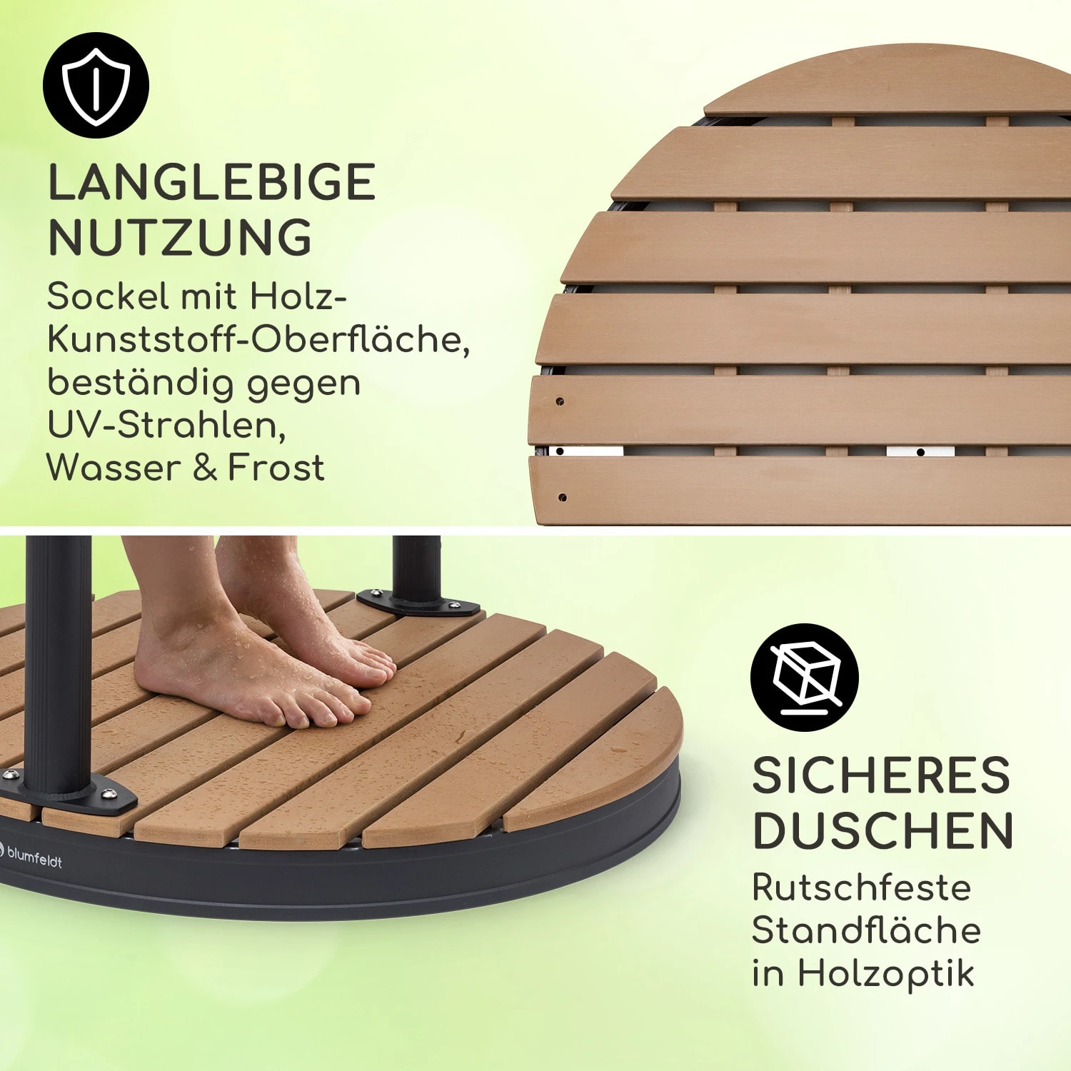 Dieses Jahr wird es ganz einfach im Garten einen kühlen Kopf zu bewahren. Dafür sorgt die blumfeldt Sumatra Falls Außendusche auf einfache und effektive Weise. Das kühle Erfrischungswunder wird einfach an den Gartenschlauch angeschlossen und schon kann der Spaß beginnen. Wasser aufgedreht und schon regnet das kühle Nass wie ein Wasserfall aus dem runden Duschkopf auf dich herab. Damit eignet sich die blumfeldt Sumatra Falls auch perfekt als Saunadusche – vor allem, da sie selbst in begrenzten Platzverhältnissen leicht einen Platz findet. Für langanhaltende Erfrischungsfreuden sorgt der clevere Mix aus robusten Materialien. Die Basis der Dusche ist aus eloxiertem Aluminium gefertigt und wird von einem rutschfesten Top aus WPC, Wood-Plastic-Composite, gekrönt. Das besteht nicht nur zu 60 % aus Holz und schont damit die natürlichen Ressourcen, es ist auch unempfindlich gegen Schimmel, Frost, Wasser und UV-Strahlung und lässt sich besonders einfach reinigen. Durch den unkomplizierten Auf- und Abbau lässt sich die Bogendusche im Winter platzsparend und frostsicher verstauen.