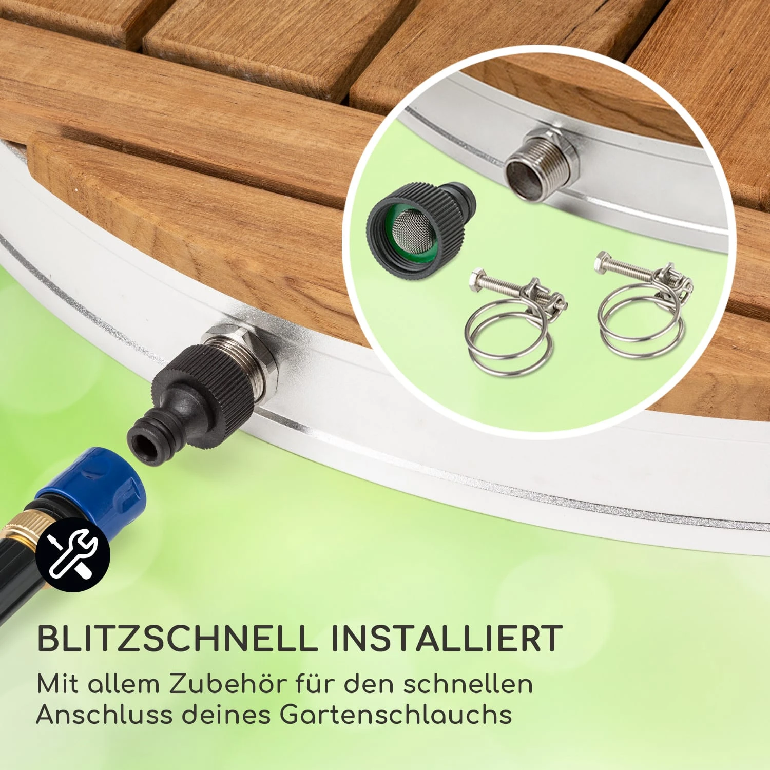 Dieses Jahr wird es ganz einfach im Garten einen kühlen Kopf zu bewahren. Dafür sorgt die blumfeldt Sumatra Teak Round Außendusche auf einfache und effektive Weise. Das kühle Erfrischungswunder wird einfach an einen Gartenschlauch angeschlossen und schon kann der Spaß beginnen. Mit einem Fußstellrad wird nicht nur das Wasser aufgedreht, sondern auch die Höhe der Fontänen bis zu 4 Metern reguliert. Dabei erfrischt die Dusche gleich doppelt, denn hier kommt das Wasser aus dem Boden. Einmal von unten kühl abspritzen und dann noch einmal sanft von oben berieseln lassen. Damit eignet sich die blumfeldt Sumatra Teak Round auch perfekt als Saunadusche – vor allem, da sie selbst in begrenzten Platzverhältnissen leicht einen Platz findet. Für langanhaltende Erfrischungsfreuden sorgt der clevere Mix aus robusten Materialien. Die Basis der Dusche ist aus eloxiertem Aluminium gefertigt und wird von einem rutschfesten Top aus Teakholz gekrönt. Teak ist besonders unempfindlich gegenüber Schädlingen, Pilzbefall, Frost und Wasser, zusätzlich lässt es sich besonders einfach reinigen.