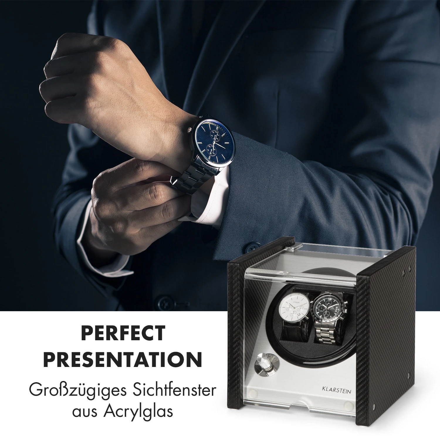 Der Tokyo 2 Uhrenbeweger überzeugt mit einem eleganten Gehäuse im Carbonfaser-Look, das sich stilvoll in jedes Raum-Ambiente einfügt. Eine Bedienfläche aus gebürstetem Aluminium verleiht der Konstruktion seinen unverwechselbaren Glanz, währende das großzügig geschnittene, von oben und frontal einsehbare Sichtfenster aus Acrylglas einen unverstellten Blick auf die Automatikuhren freigibt.