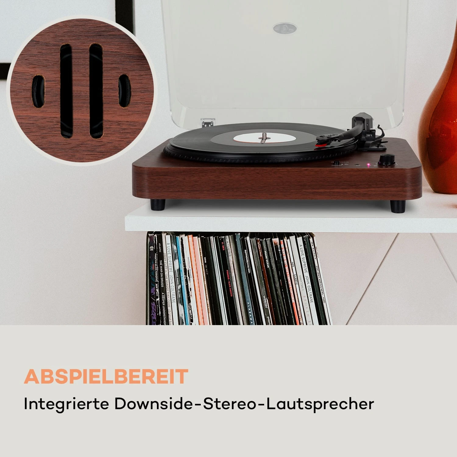 Reduziert auf das Wesentliche überzeugt der auna TT-Classic Light Schallplattenspieler mit einer einfachen Bedienung und modernen Komponenten. Sein laufruhiger Riemenantrieb arbeitet wahlweise mit 33, 45 oder 78 Umdrehungen in der Minute und eignet sich für alle Standardschallplatten. Die integrierten Downside-Stereo-Lautsprecher garantieren Musikgenuss ohne zusätzliche Geräte. Wem das nicht reicht, kann den Turntable per Bluetooth-Konnektor auch drahtlos mit anderen Lautsprechern verbinden. Und natürlich steht auch ein passender RCA-Line-Ausgang zur Verfügung, um den TT-Classic Light in ein größeres HiFi-Ensemble zu integrieren. Der 3,5-mm-Klinken-Eingang ermöglicht außerdem die Audio-Wiedergabe von weiteren Geräten über den Plattenspieler.
