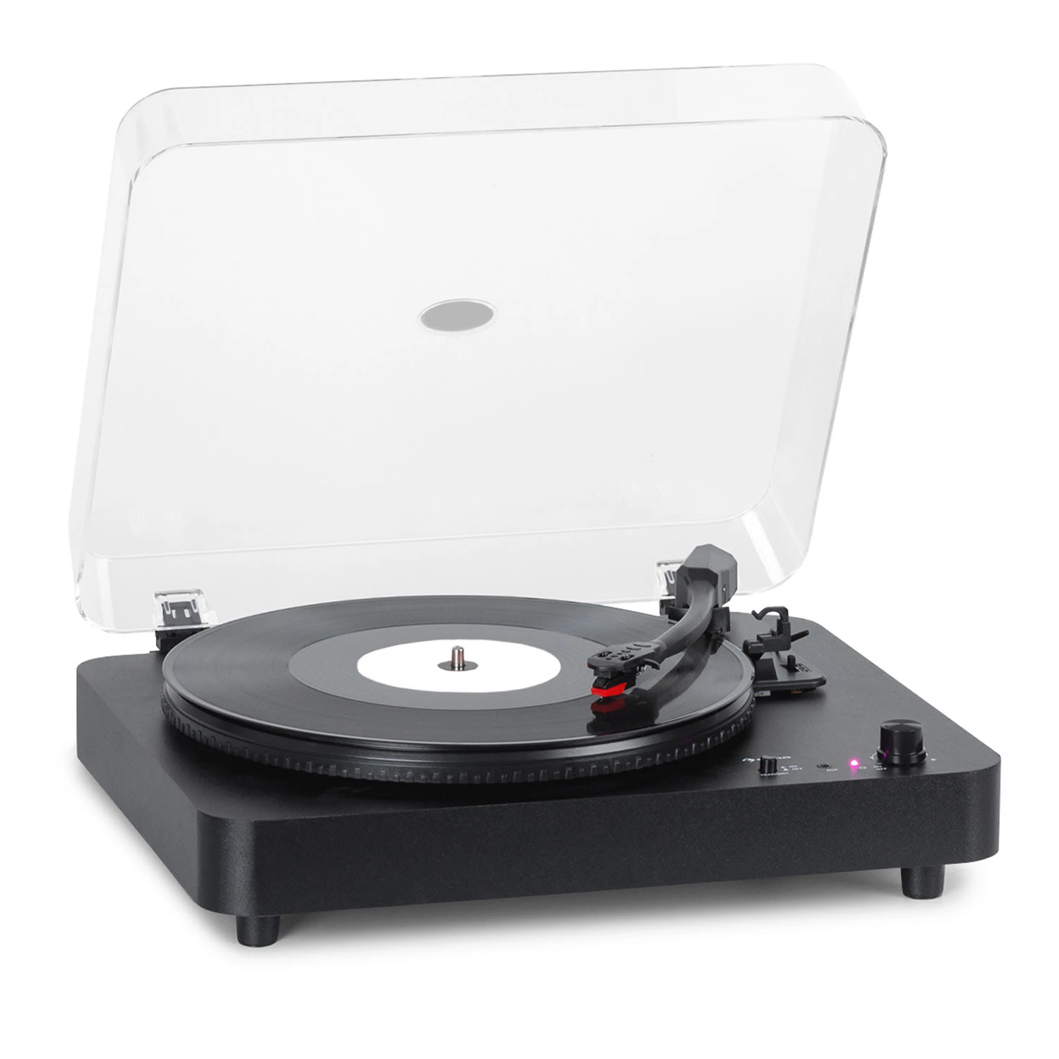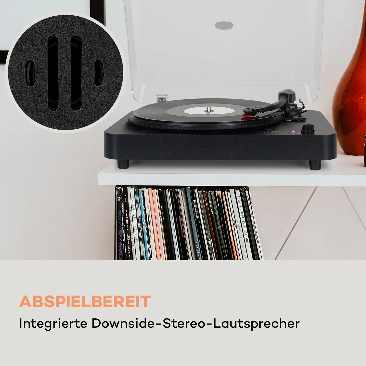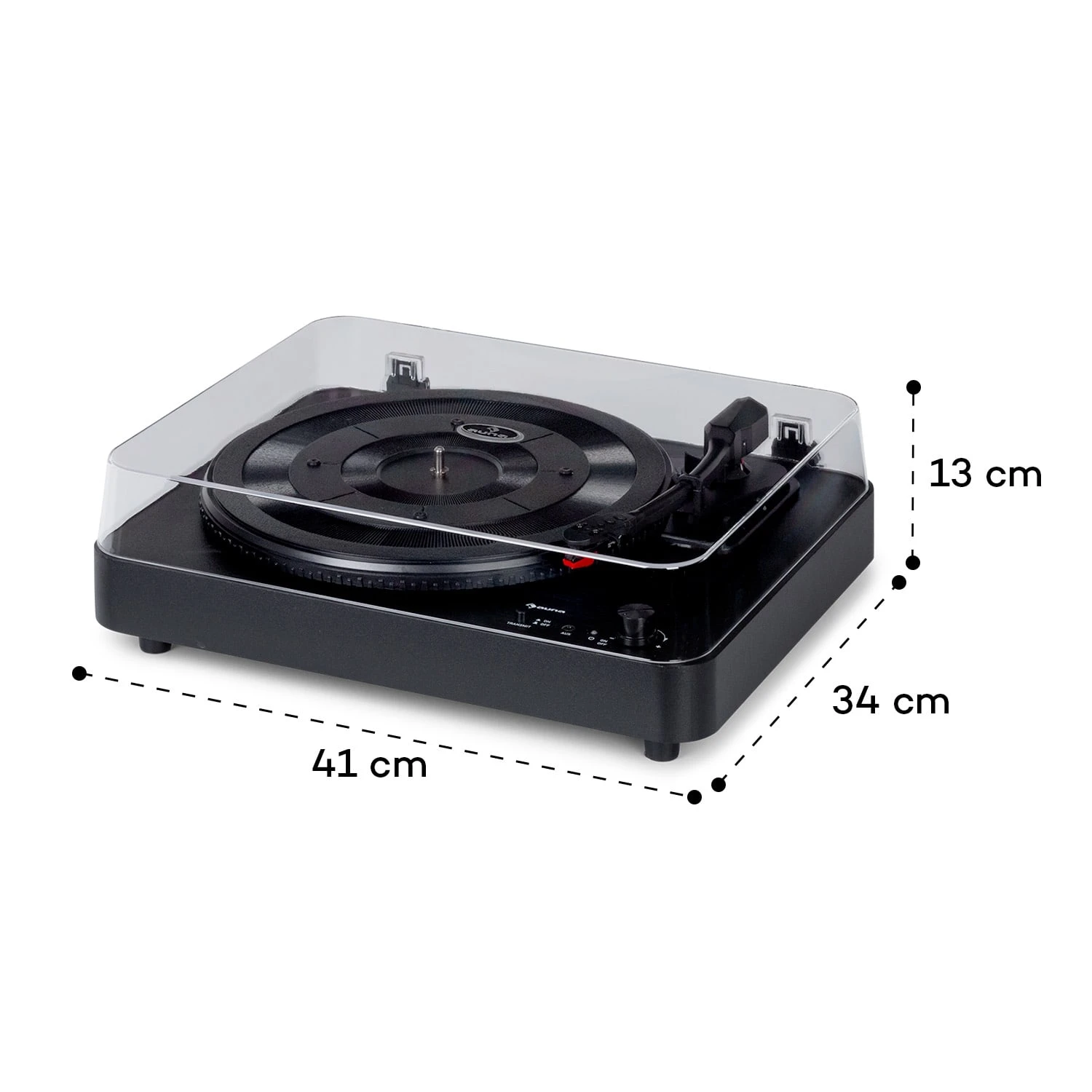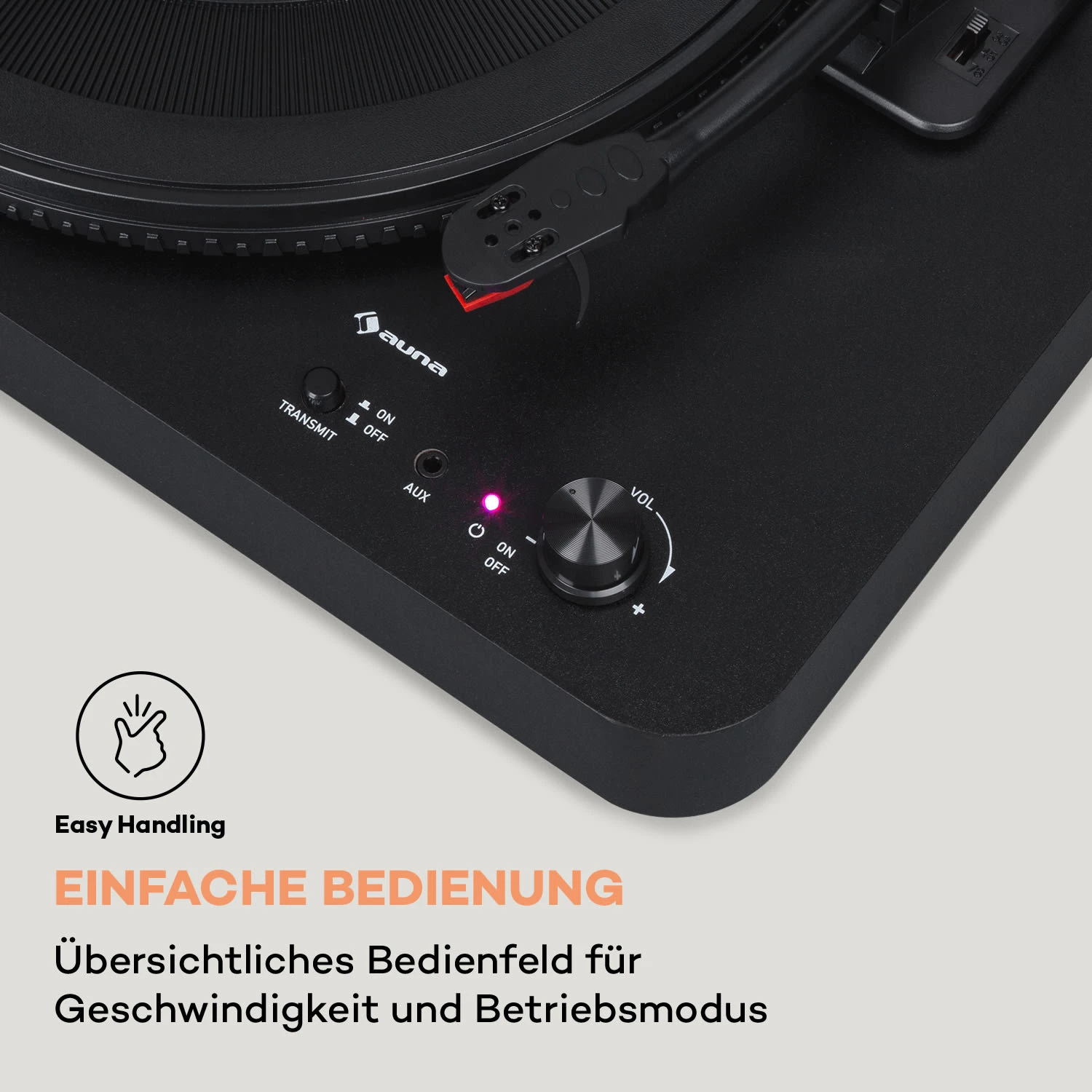 Reduziert auf das Wesentliche überzeugt der auna TT-Classic Light Schallplattenspieler mit einer einfachen Bedienung und modernen Komponenten. Sein laufruhiger Riemenantrieb arbeitet wahlweise mit 33, 45 oder 78 Umdrehungen in der Minute und eignet sich für alle Standardschallplatten. Die integrierten Downside-Stereo-Lautsprecher garantieren Musikgenuss ohne zusätzliche Geräte. Wem das nicht reicht, kann den Turntable per Bluetooth-Konnektor auch drahtlos mit anderen Lautsprechern verbinden. Und natürlich steht auch ein passender RCA-Line-Ausgang zur Verfügung, um den TT-Classic Light in ein größeres HiFi-Ensemble zu integrieren. Der 3,5-mm-Klinken-Eingang ermöglicht außerdem die Audio-Wiedergabe von weiteren Geräten über den Plattenspieler.