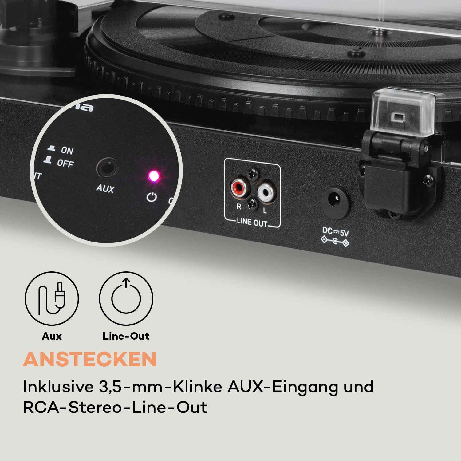 - Anschlüsse: 1 x 3,5-mm-Klinke-AUX-In, 1 x RCA-Stereo-Line-Out