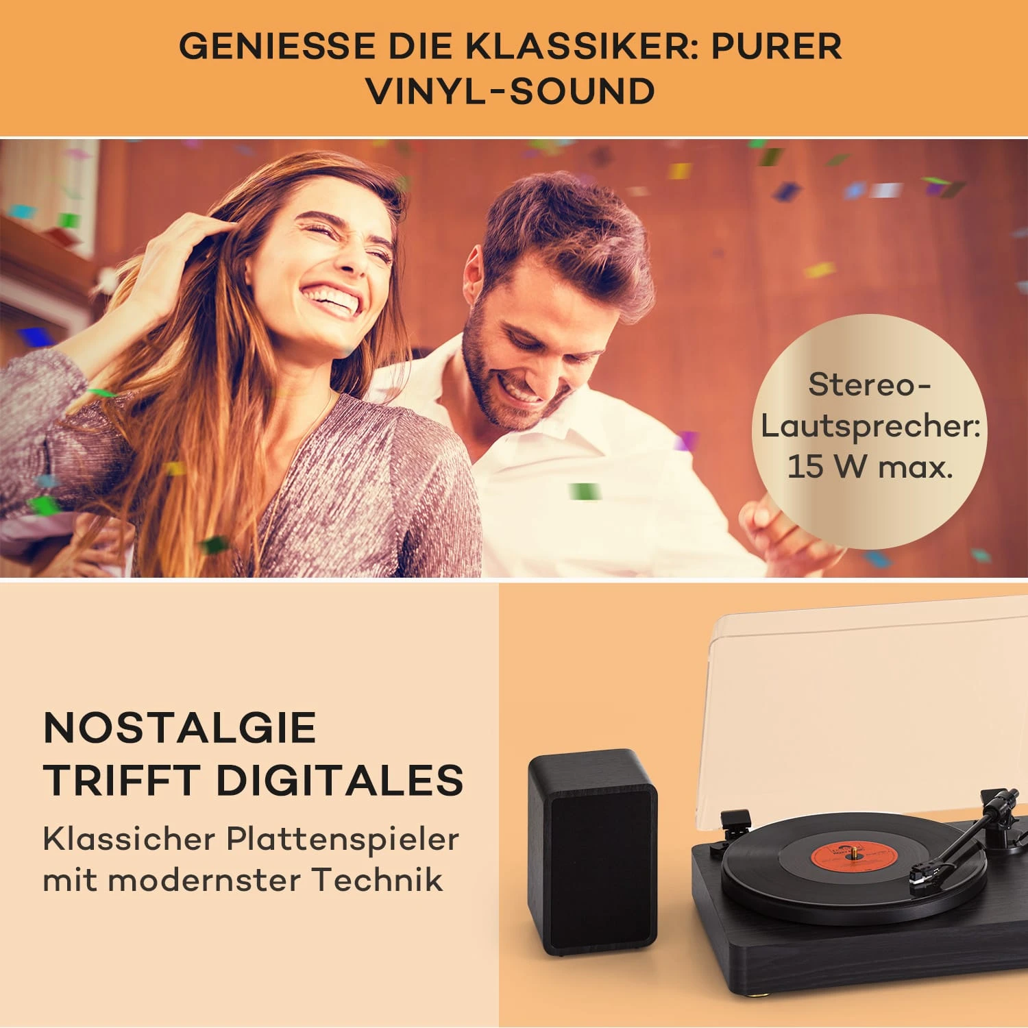 Klassisch, schlicht, harmonisch: Der edle Metallplattenspieler TT-Play Prime von auna holt die besten Töne aus deiner Schallplattensammlung hervor. Der Riemenantrieb ermöglicht das Abspielen von Langspielplatten sowie kleiner Single-Scheiben, wahlweise mit einer Geschwindigkeit von 33 1/3 oder 45 Umdrehungen pro Minute. Lehne dich zurück und genieße augenblicklich ein volles Klangerlebnis deiner Lieblingslieder, denn der Plattenspieler verfügt bereits über dazugehörige Stereo-Lautsprecher. Dank hochwertiger Verarbeitung und dem MM Tonabnehmersystem von Audio Technica gleitet die Nadel sanft über das Vinyl und entlockt ihm Musik in hoher Klangqualität. Zudem kannst du den TT-Play Prime sogar in ein modernes Wiedergabegerät verwandeln: Streame einfach Musik und Podcasts von Smartphone oder Tablet und spiele sie dank Bluetooth-Schnittstelle über deinen neuen Plattenspieler ab.