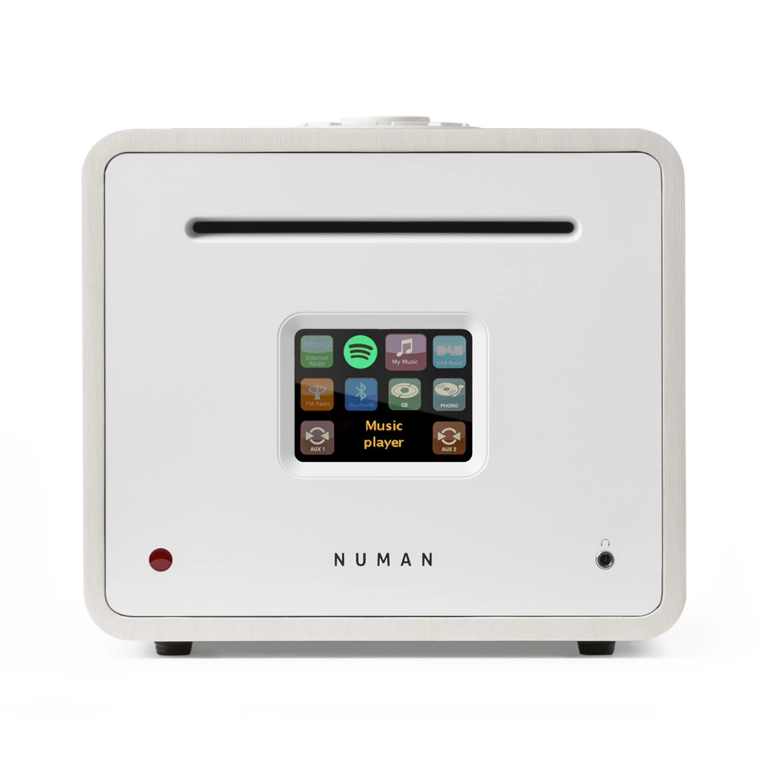 Die gleichermaßen dezente wie schlichte Retro-Optik des NUMAN Unison lässt designaffine Herzen höher schlagen. Die Technik im Innern des All-in-One-Receivers überzeugt audiophile Musikliebhaber. Neben einem integrierten CD-Player, der umstandslos die gängigen CD-Formate wie Audio-, WMA- und MP3-CDs sowie CD-R und CD-RW wiedergibt, findet sich ein USB-Anschluss für den Anschluss von Massenspeichern und die Möglichkeit zur kabellosen Verbindung via Bluetooth.