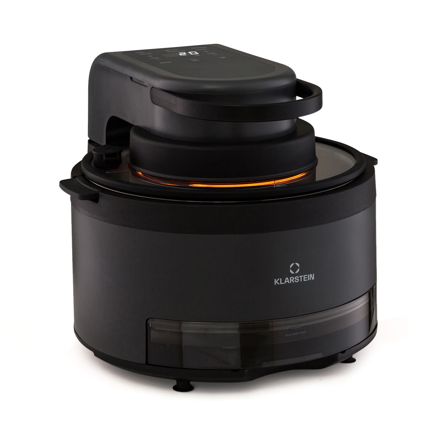 Die Klarstein Vendure Heißluftfritteuse mit Dampffunktion ist ein 3-in-1-Gerät mit den Funktionen Heißluft, Dampfgaren sowie Heißluft & Dampfgaren. Dank 1250 Watt Leistung und zirkulierender Heißluft wird die Wärme schnell und optimal verteilt und der Inhalt von allen Seiten schonend und rasant gegart. Die zuschaltbare Dampffunktion im Dauerbetrieb bis 60 Minuten sorgt dabei zuverlässig für den idealen Feuchtigkeitsgehalt. Mit seinen 5 Litern Volumen bietet der große Frittierkorb viel Platz zur Zubereitung einer großen Menge Pommes Frites, Hähnchenkeulen, Chickenwings aber auch Gemüse, Fisch und sogar Kuchen. 6 wählbare Programme erleichtern dabei die Bedienung und ermöglichen so für jede Garmethode die optimale Einstellung. Zudem sind alle nicht-elektronischen Teile spülmaschinengeeignet.