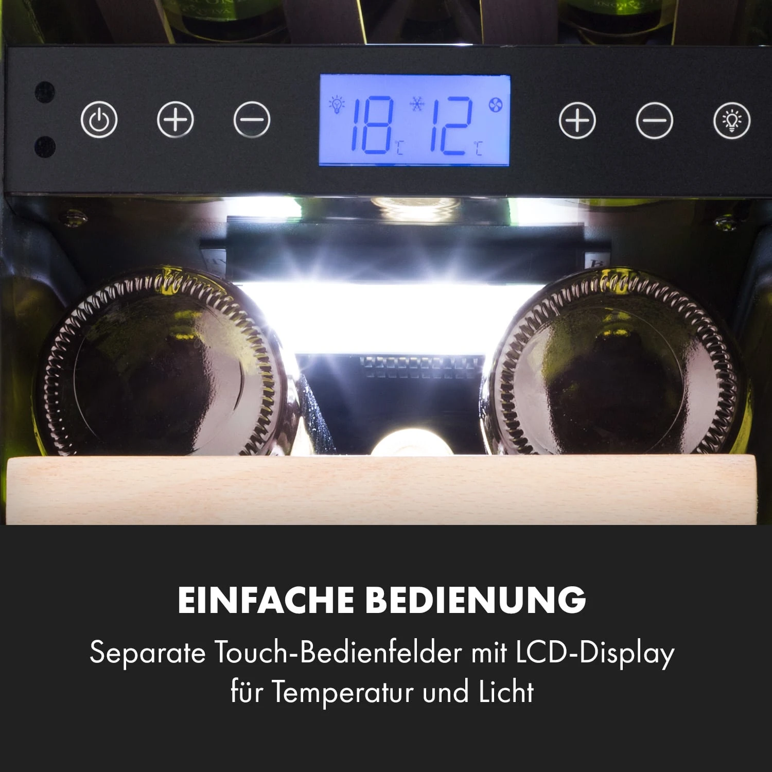 Edles Design und farbige Präsentation: Der Klarstein Vinovilla 17 Built-In Duo Doppelzonen-Weinkühlschrank passt dank Slim-Design in nahezu jede Lücke! Seine zwei Zonen kannst du separat temperieren, was dir eine zeitgleiche Kühlung und Lagerung von Rot- und Weißweinen ermöglicht. Aber auch Champagner, Schaumweine, Sekt oder andere delikate Tropfen lagern im Weintemperierer langfristig optimal. Neben besten Lager- und Kühlungsverhältnissen bietet er deiner Weinsammlung eine extravagante Bühne: Hinter Glas präsentieren sich die Flaschen wunderbar – rot, blau oder weiß beleuchtet.