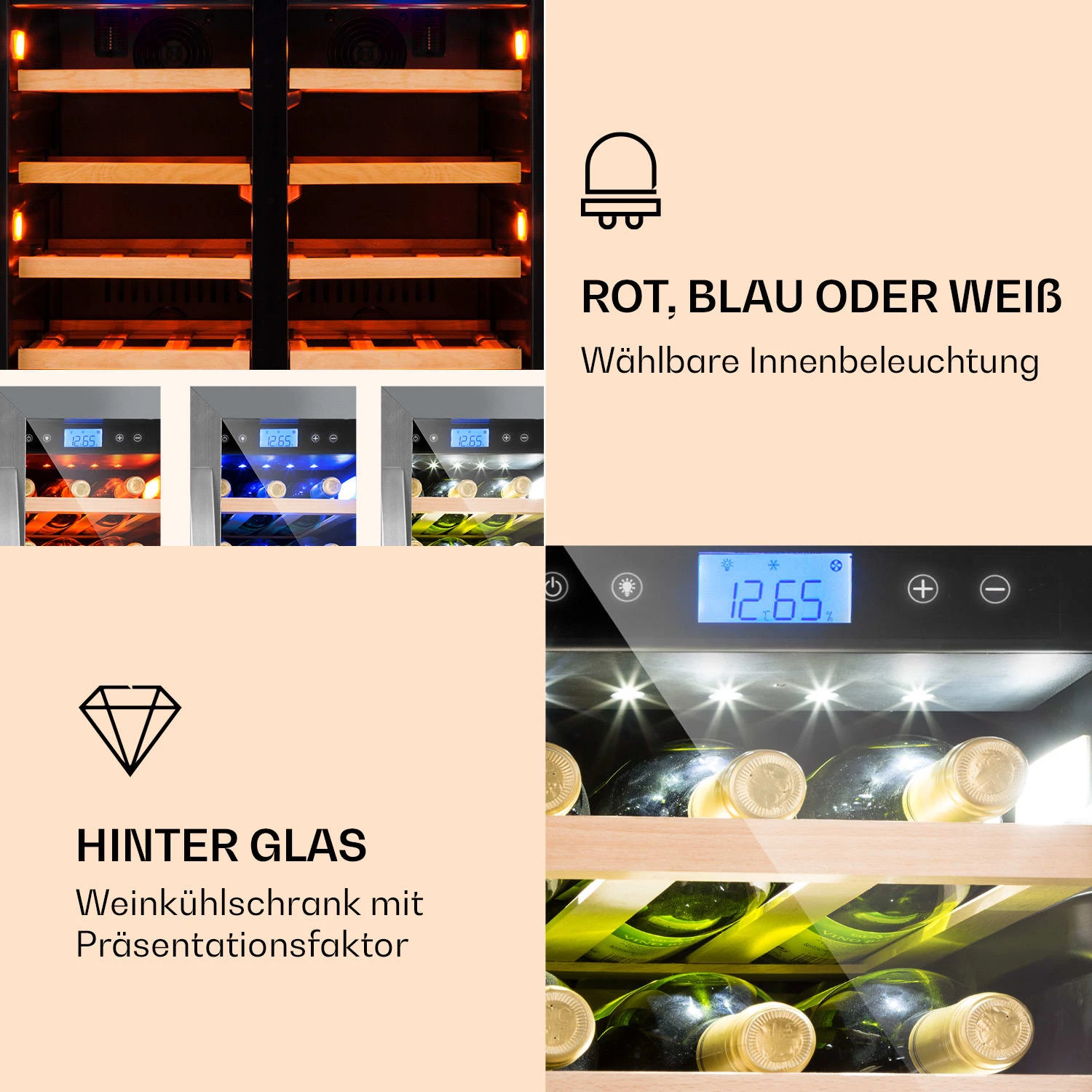- Temperatur beider Kühlzonen: 5 bis 20 °C