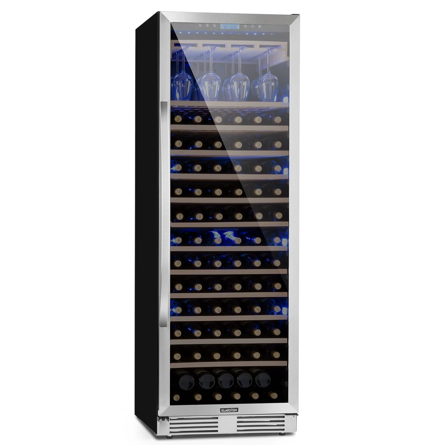 Der beleuchtete Klarstein Vinovilla Grande 165 Built-in Uno Weinkühlschrank bietet auf 13 Buchenholz-Einschüben Platz für 165 Flaschen Wein. Die edlen Tropfen ruhen bei passender Lagerungstemperatur, welche du bequem per Touch-Display wählen kannst. Perfekt gekühlten Genuss erlebst du, da du parallel auf dem Glasträgerhalter bis zu 24 Weingläser auf die gleiche Kühltemperatur bringen kannst.