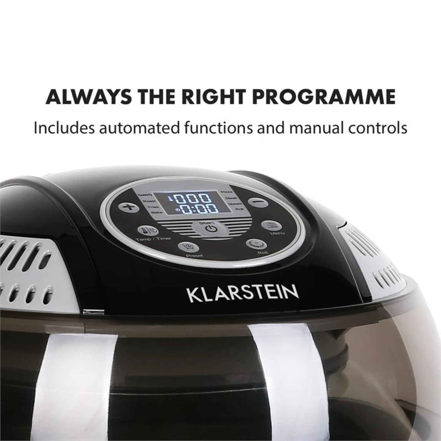 Temperatur und Laufzeit können zum Einen manuell eingestellt werden, wobei Temperaturen zwischen 50° bis 230° C und eine Laufzeit bis maximal eine Stunde genügend Spielraum für die eloquente Zubereitung verschiedenster Köstlichkeiten bieten. Zum Anderen stehen vorprogrammierte Automatikprogramme bereit, um u.a. Pommes, Grillhähnchen, Kuchen, Pizza, Steak und Schaschlik minutengenau und perfekt zuzubereiten. Mit der Timerfunktion ist der zeitgesteuerte Start desHalogenofens möglich, sodass Sie zum Aufstehen frisch gebackene Brötchen oder auch ein fertiges Abendessen nach einem stressigen und langen Arbeitstag erwarten.