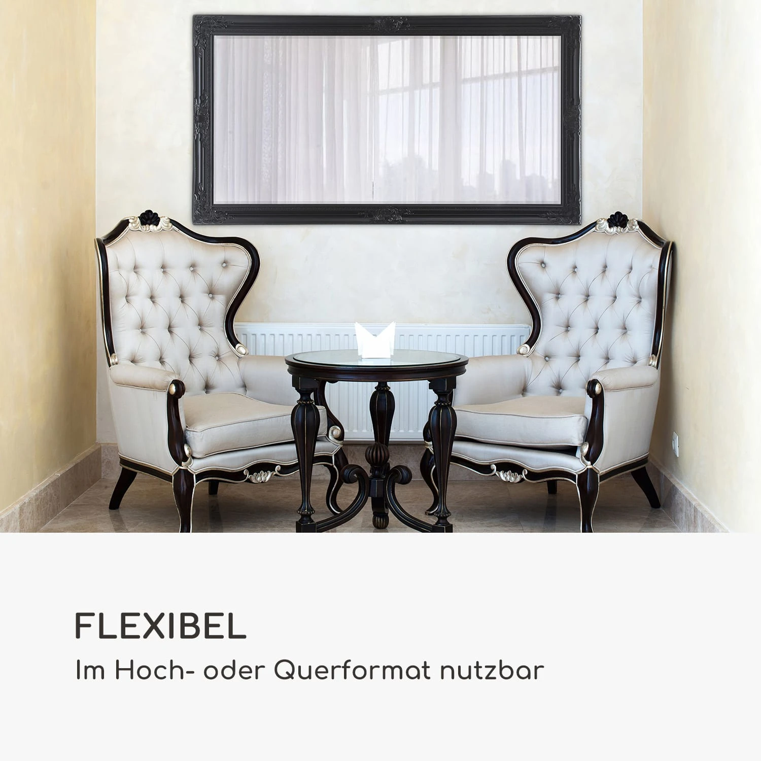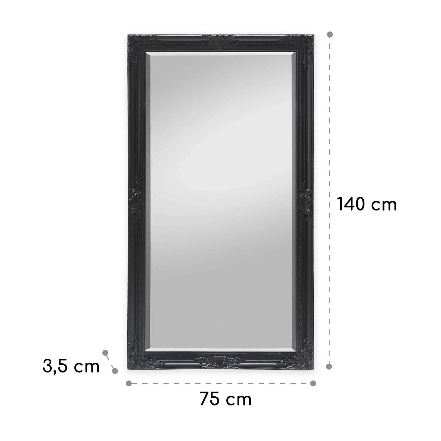 Der exklusive Wandspiegel Wembley von Casa Chick by blumfeldt verleiht jedem Raum einen luxuriösen Hauch von Rokoko. Kunstvolle Verzierungen säumen den gesamten Rahmen des Spiegels – durch zarte Formen und Linien wirken diese dezent pompös und sind ein wunderschönes Detail für alle Liebhaber antiker Epochen. Dank seiner Größe ist der elegante Spiegel ideal für den Eingangsbereich, das Wohn- oder auch das Schlaf- und Ankleidezimmer in deinem Zuhause. Du kannst ihn sowohl im Quer- als auch im Hochformat aufhängen. Ebenso kannst du ihn auch stehend nutzen und deinen Raum mit ihm dekorativ gestalten. Rückseitig sind die entsprechenden Aufhängungen für eine sichere Montage an der Wand bereits vorhanden. Das hochwertige Spiegelglas in 4 mm Stärke schenkt dir ein realistisches Spiegelbild. Das Glas verfügt über konisch geschliffene Kanten, welche die Exklusivität des Spiegels gekonnt untermalen.